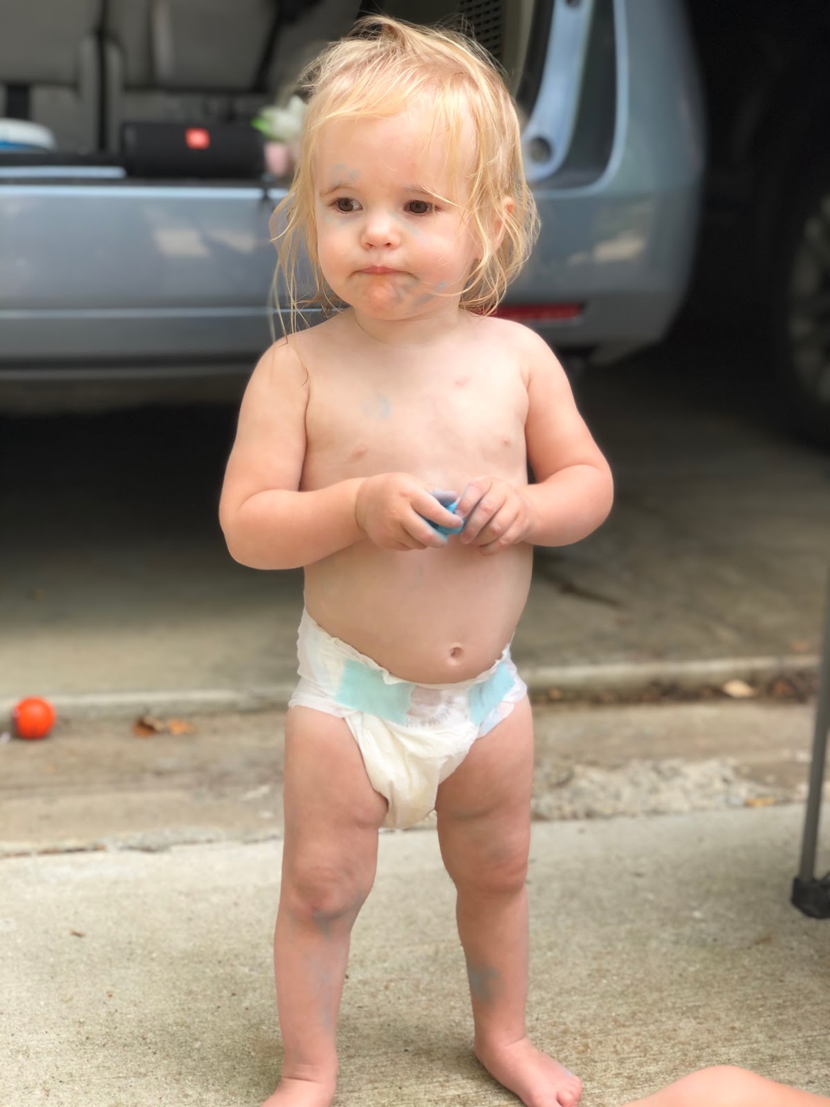 Then we took off her diaper again because she was acting like she wanted to go back in the pool, but instead she wandered around the yard naked and plopped herself down in the middle of Eleanor and Addison's game of tic tac toe.